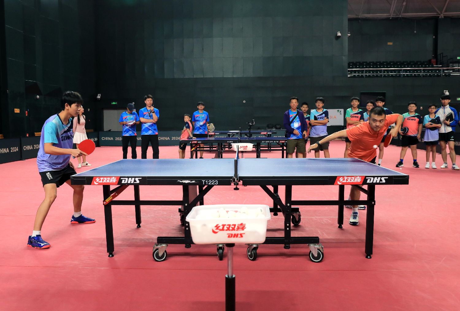 12日在中国国家队出征巴黎奥运会前备训的成都市全国重点乒乓球运动学校训练馆内,小小的乒乓球在球桌上飞速旋转、往来穿梭,场内呼喊声和掌声此起彼伏。成都、香港、澳门的青少年轮番上阵,向原中国男子乒乓球运动员朱霖峰发起挑战。
