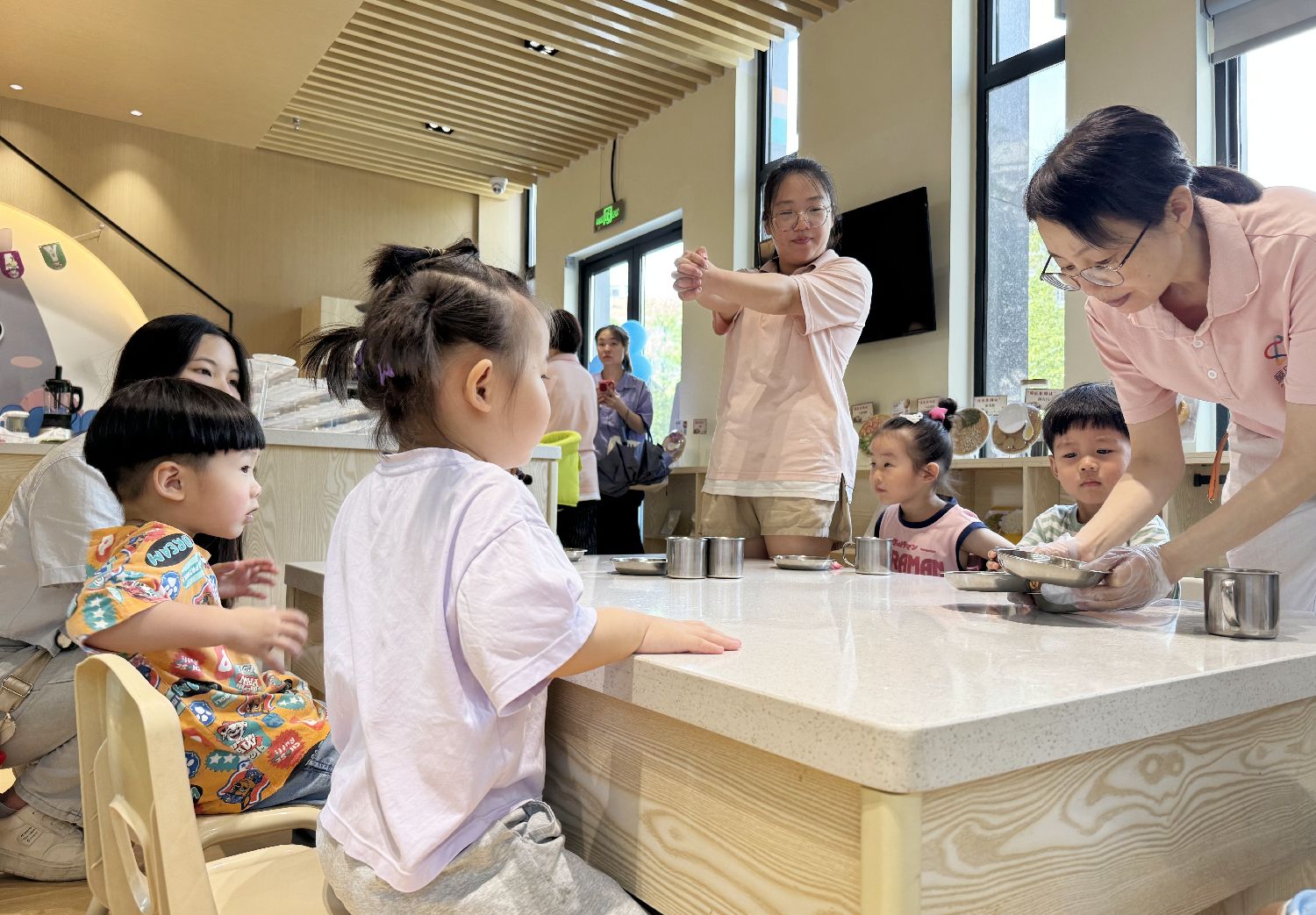 缤纷成长驿站是社区推出的高质量托育和家庭教育服务机构,包括全日制托育园、成长驿站、宝妈成长俱乐部、课后服务等内容。据介绍,针对不同年龄段的儿童,尤其是0至3岁的儿童,成长驿站定制了不同的托育计划,确保儿童健康成长。图为幼师带领孩子们用餐。