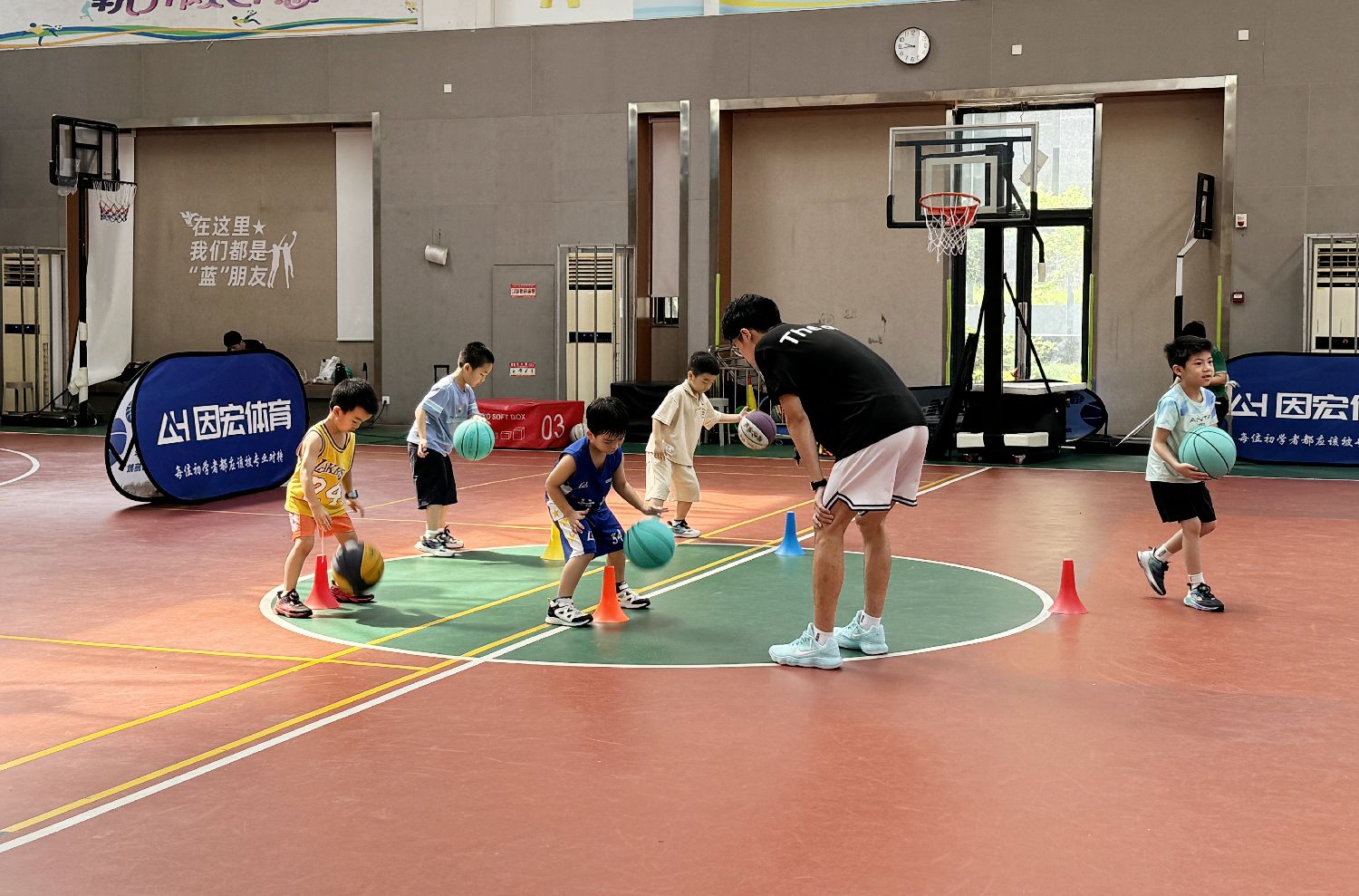 缤纷健身中心是社区为居民免费提供的健身场所,配有跑步机、动感单车、力量训练器械等,可满足多样的健身需求。正值暑假,在健身中心的室内篮球场,小朋友们正在教练的带领下练习篮球。