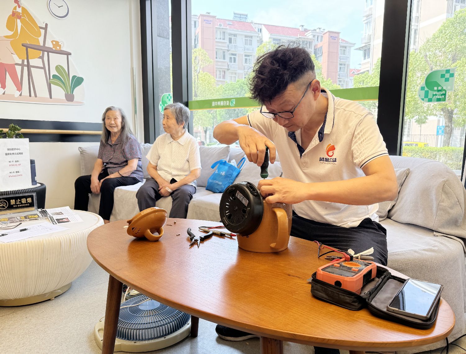 “一老一小”是社区服务的重点。缤纷颐养中心设有“小修小补站”,为老年人提供小家电维修服务。图为一名工作人员为老人维修电器。