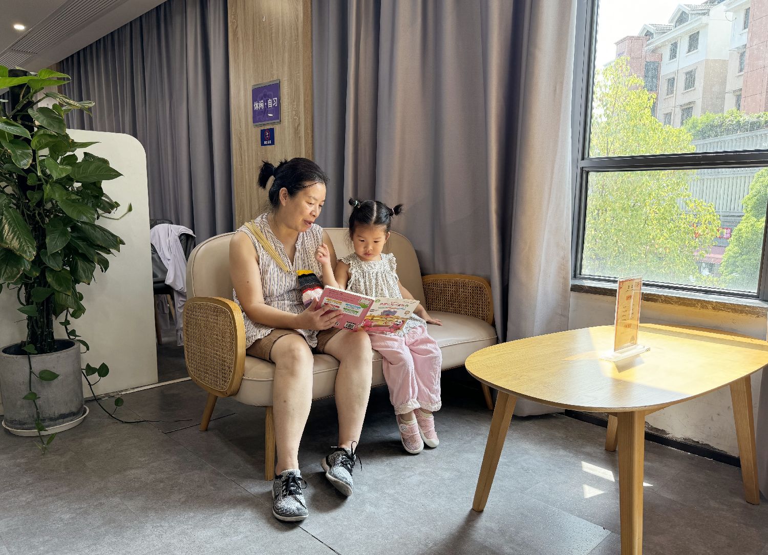 缤纷会客厅还有供居民自习、读书、放松的地方。图为一名家长和孩子一起读书。