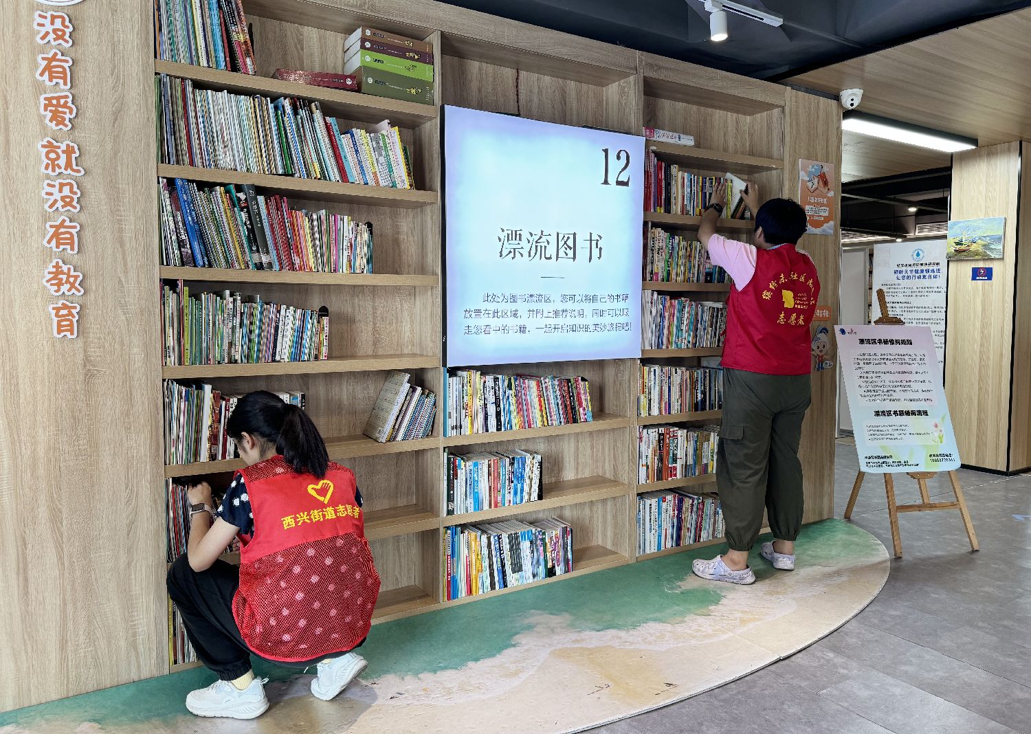 在缤纷会客厅的“漂流图书”区域,居民可以将自己暂时不需要的书籍放在这里,并附上说明,达到居民共享书籍的效果。图为工作人员正在整理图书。