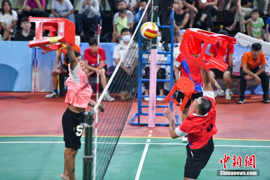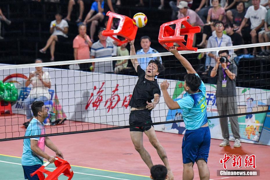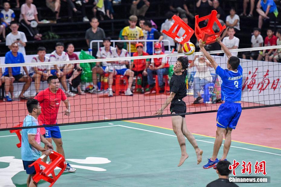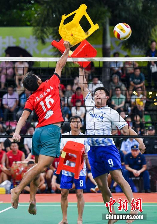 在“排球之乡”文昌,除了常规的排球比赛,还能看到很多村民自创的花式排球赛。用板凳打、穿拖鞋打、大家手牵手一起打……其中“板凳”排球最具特色,球场上的球员用板凳来发球、接球、传球甚至还能跳起来扣球,场面十分有趣。