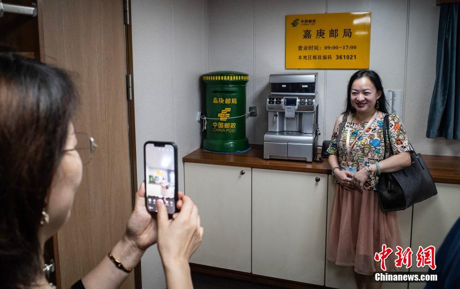 图为登船参观的市民在船舱内特设的“嘉庚邮局”处拍照,邮政编码中的“36”代表厦门,“1021”则是陈嘉庚先生的生日。
