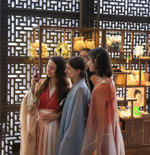 8月7日至10日,中国工艺美术馆(中国非物质文化遗产馆)推出“立秋·七夕”主题系列夜场活动。图为外国游客在现场体验“穿着汉服逛博物馆”。(图片来源:中国工艺美术馆供图)