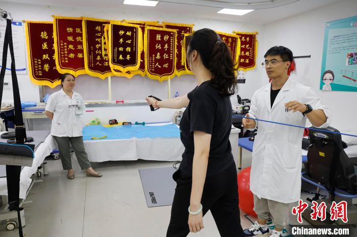 图为19日晚,上海市黄浦区打浦桥街道社区卫生服务中心,市民在医生的指导下进行康复训练。