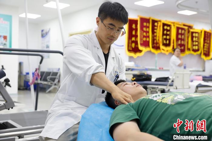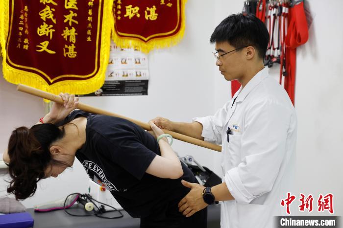 图为19日晚,上海市黄浦区打浦桥街道社区卫生服务中心,市民在医生的指导下进行康复训练。(图片来源:本文图片均自中新网)