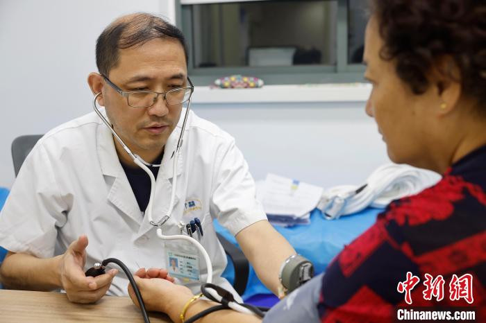 图为19日晚,在上海市黄浦区打浦桥街道社区卫生服务中心,医生为市民测量血压。