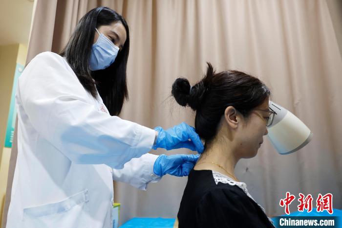 图为19日晚,上海市黄浦区打浦桥街道社区卫生服务中心,医生为市民进行针灸。