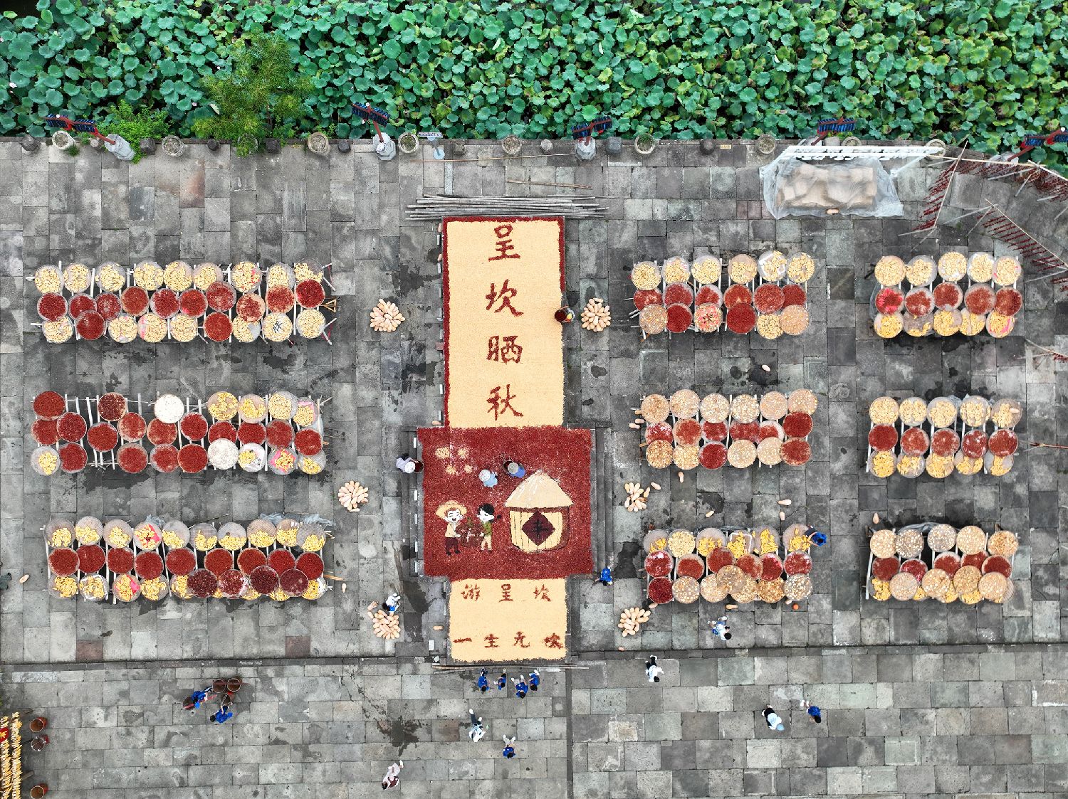 8月19日,在安徽省黄山市徽州区呈坎村,村民在晒场上晾晒农作物(无人机照片)。