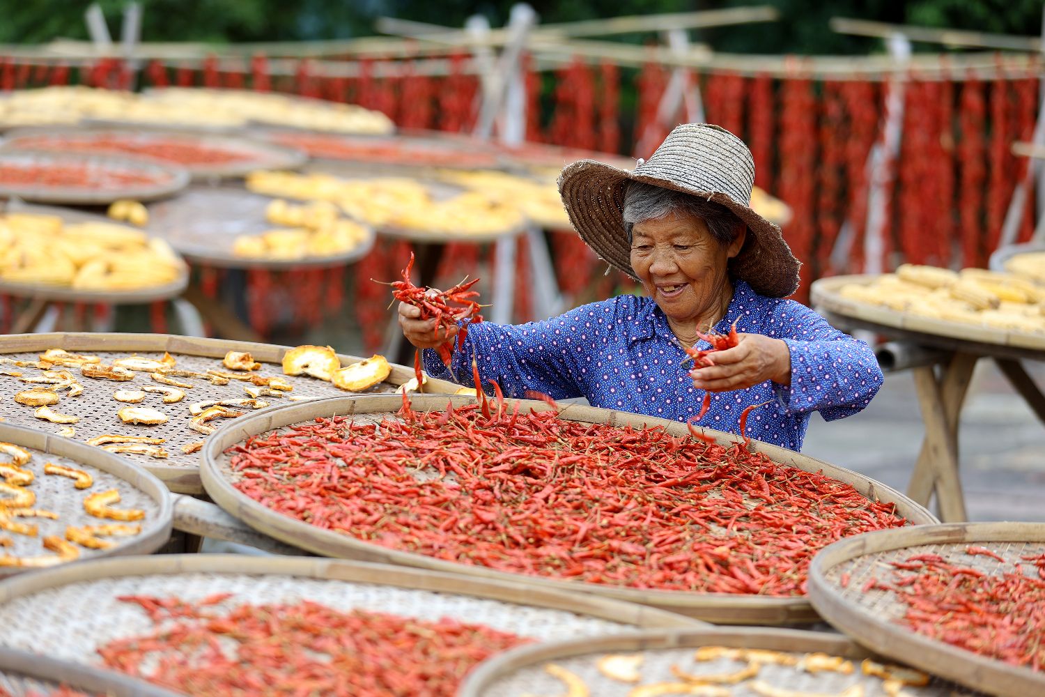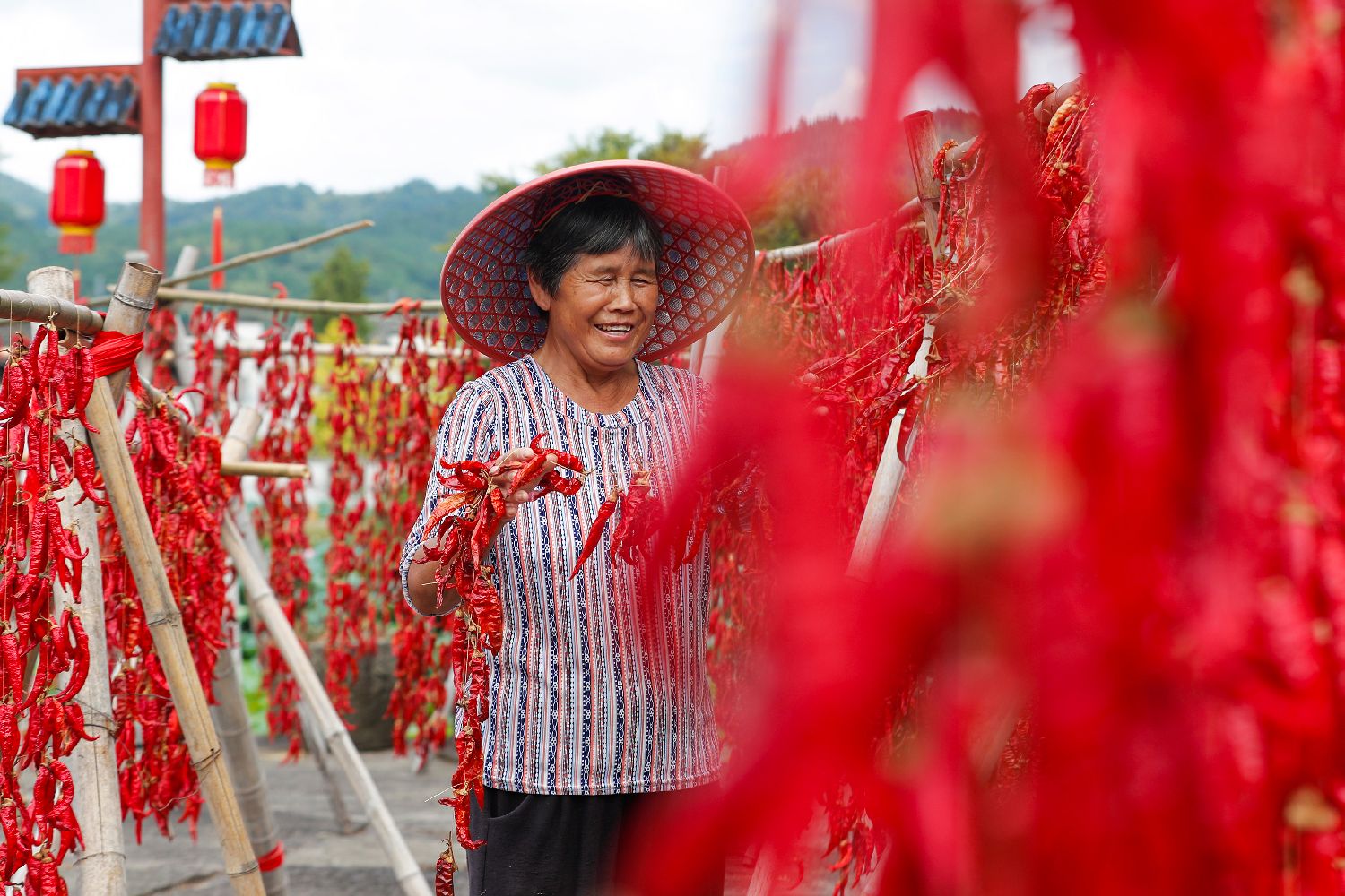 8月19日,安徽省黄山市徽州区呈坎村村民在晒场上晾晒红辣椒。