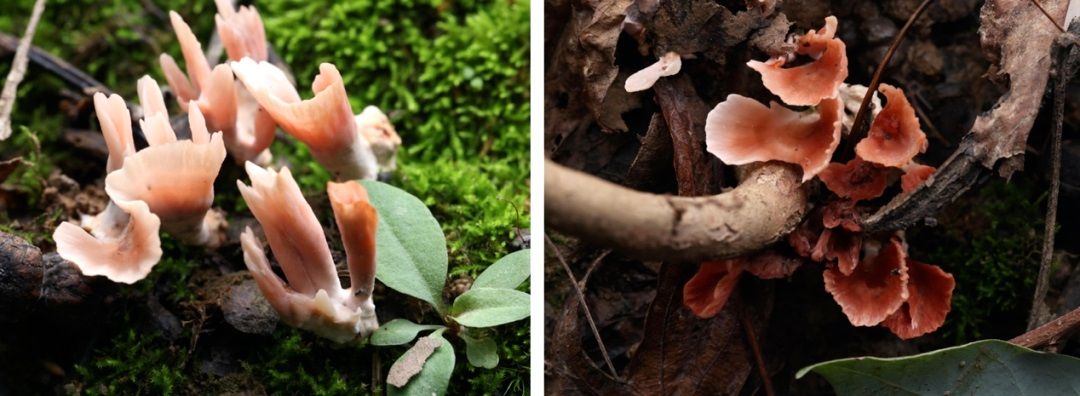 在采集的标本中,一种柄杯菌属物种引起了沈珊的注意。据沈珊介绍,该标本为一年生,在形态学上,幼时为杆状、匙形或扇形,扇形两侧逐渐连在一起,形成完整的杯形,担子果表面光滑,鲜嫩时呈橙红色,干燥后呈浅黄色,呈明显的同心状和放射状带状。该物种与相近物种巴西柄杯菌、热带柄杯菌均存在显著的形态学差异。