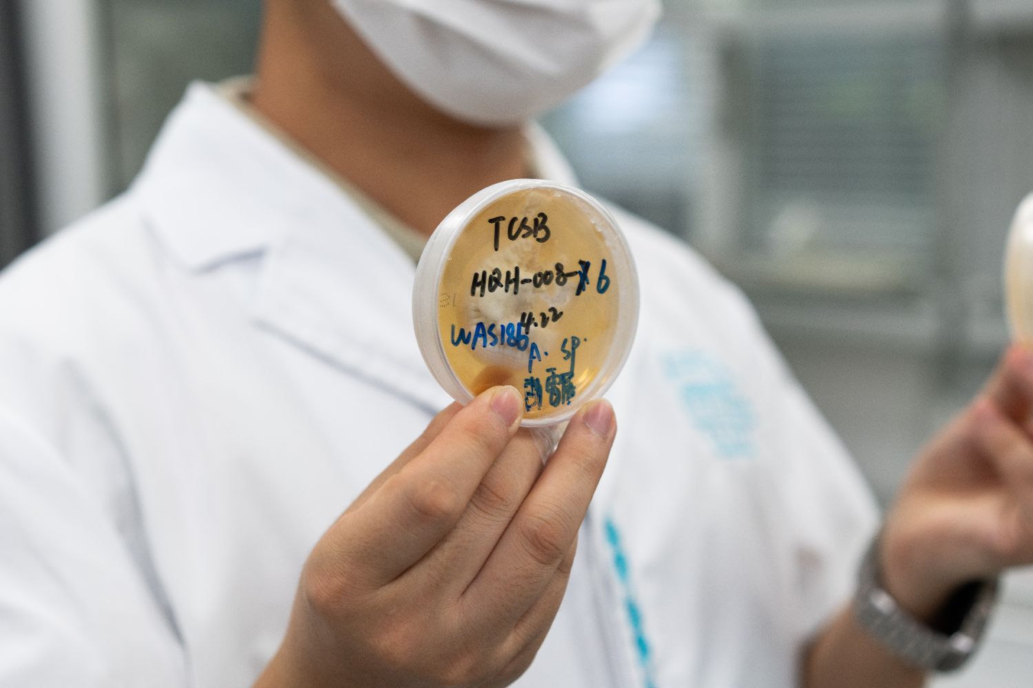 重庆中国三峡博物馆文物保护与考古部工作人员展示从文物上采集的霉变样本。(图片来源:本文图片均来自中新社)