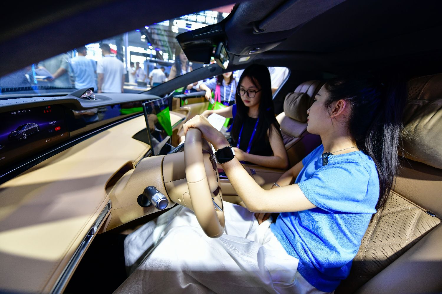 8月28日,参会人员在数博会上体验新能源智能驾驶汽车。