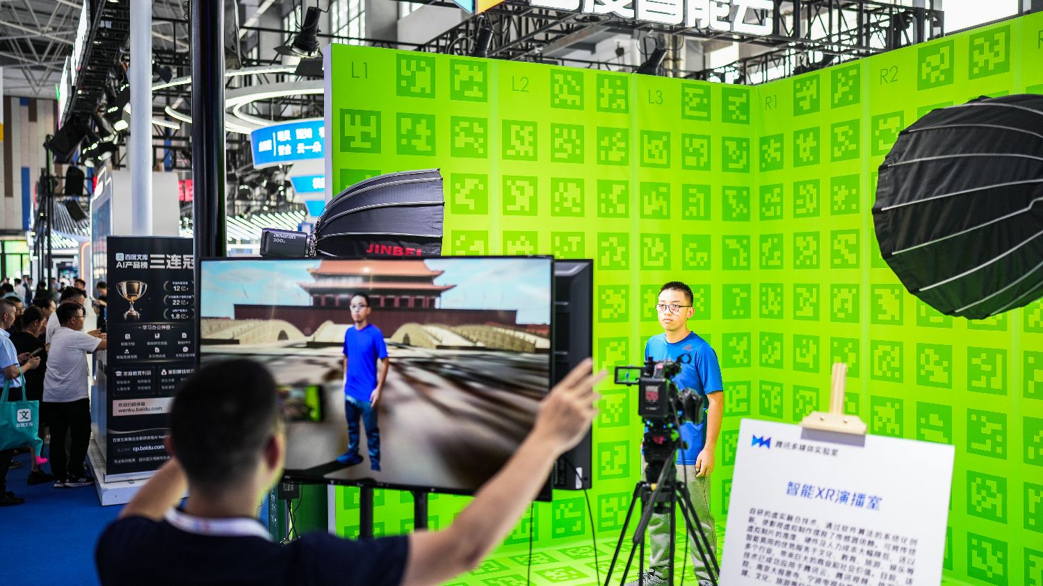8月28日,参观者在数博会展馆内体验智能XR演播室。
