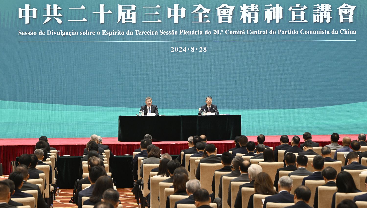 8月28日,全国人大宪法和法律委员会副主任委员、全国人大常委会法制工作委员会主任沈春耀,以及中国商务部党组书记、部长王文涛在澳门宣讲中共二十届三中全会精神。(图片来源:澳门特区政府新闻局供图)