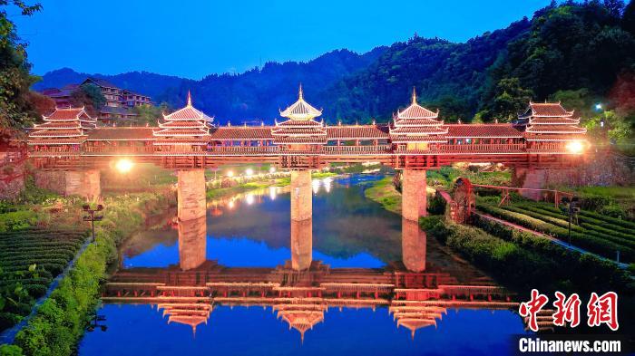 图为无人机航拍的程阳永济桥夜景。