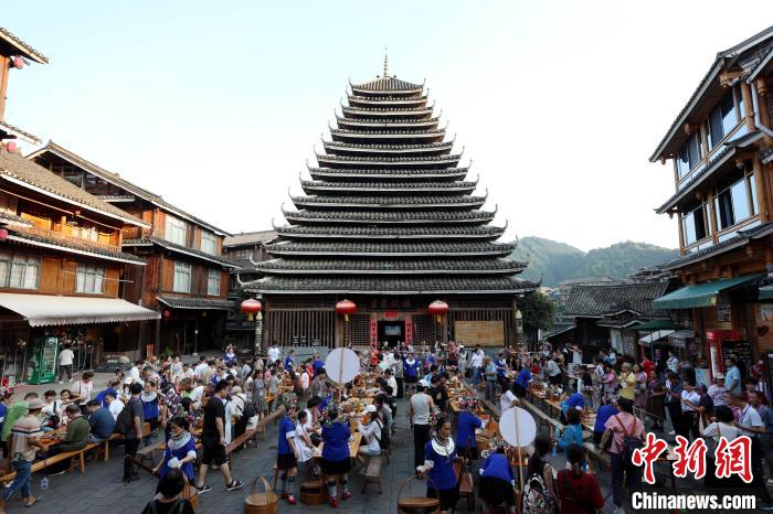 8月28日,游客在广西三江侗族自治县林溪镇程阳八寨景区观楼桥、赏歌舞、品侗宴,体验侗乡特色民俗风情。