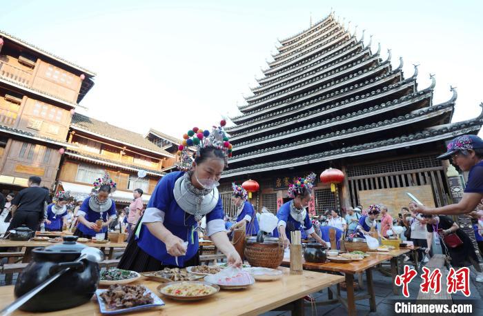 图为游客在体验侗族百家宴。