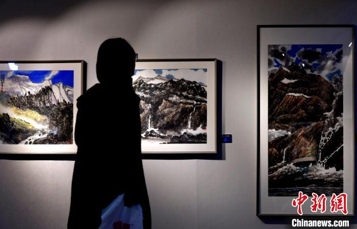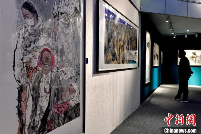图为民众驻足欣赏展览中的作品。