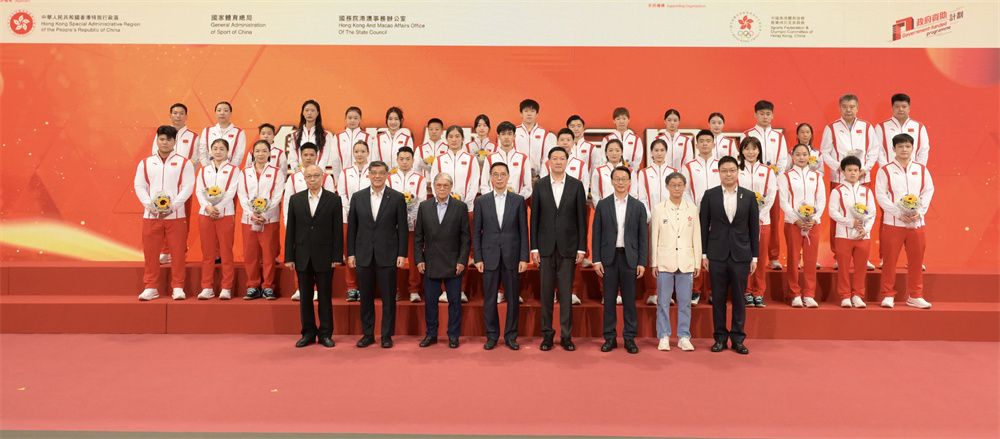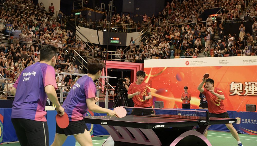 这是巴黎奥运会内地奥运健儿代表团访港交流的第三天。马龙、樊振东、王楚钦、郑思维、黄雅琼、黄雨婷、邹敬园等运动员及教练员当日上午来到伊利沙伯体育馆,进行乒乓球、羽毛球、体操等项目的示范演出。