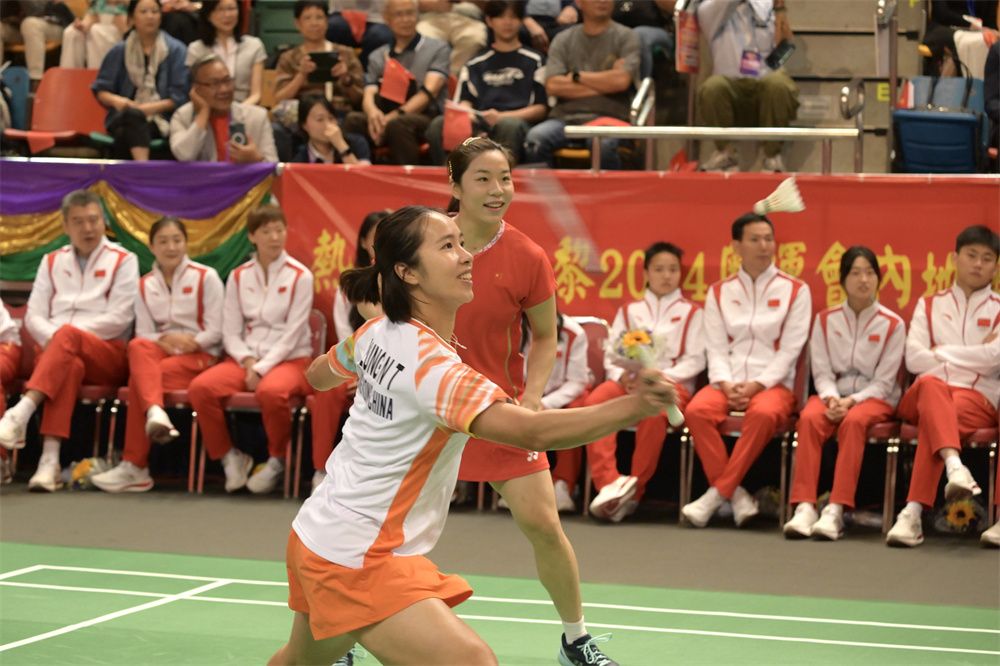图为中国内地羽毛球运动员贾一凡(右)与香港羽毛球运动员杨雅婷(左)出席示范表演。