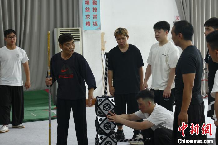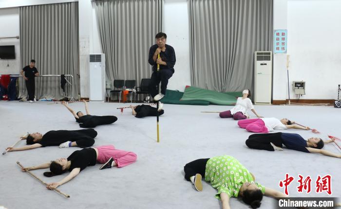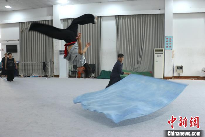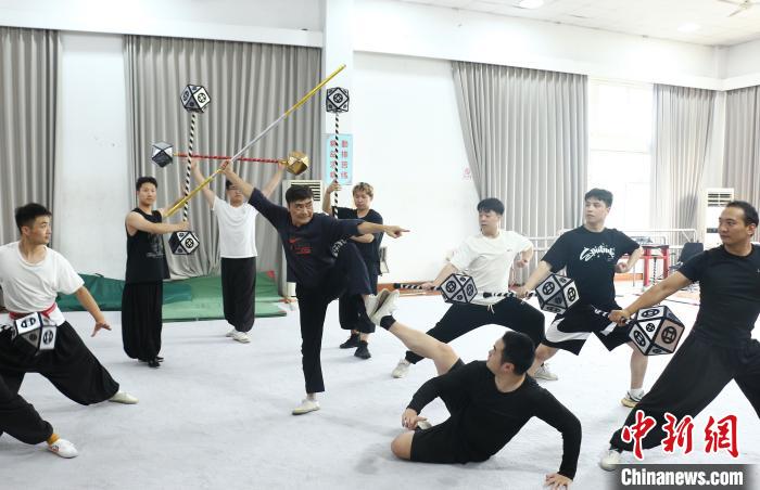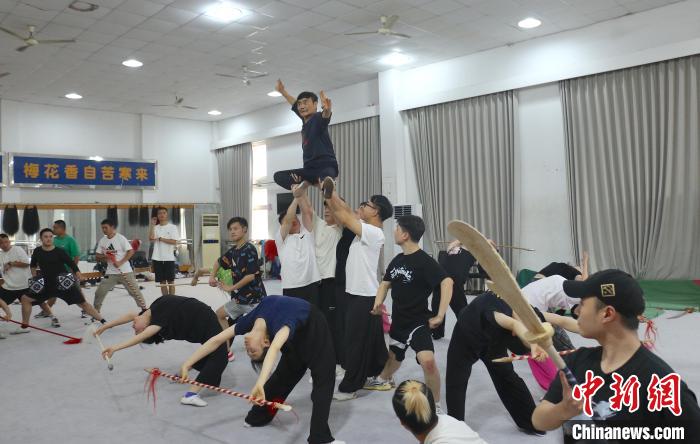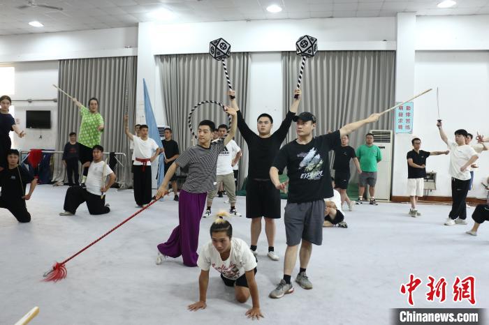 图为孙悟空扮演者、素称“江南美猴王”的刘建杨(中上方)和青年演员们加紧排练。(图片来源:本文图片均自中新网)