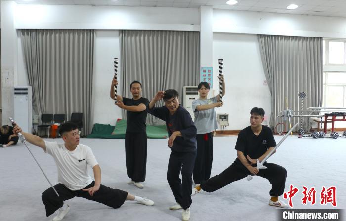 图为孙悟空扮演者、素称“江南美猴王”的刘建杨(左二)指导青年演员们排练。