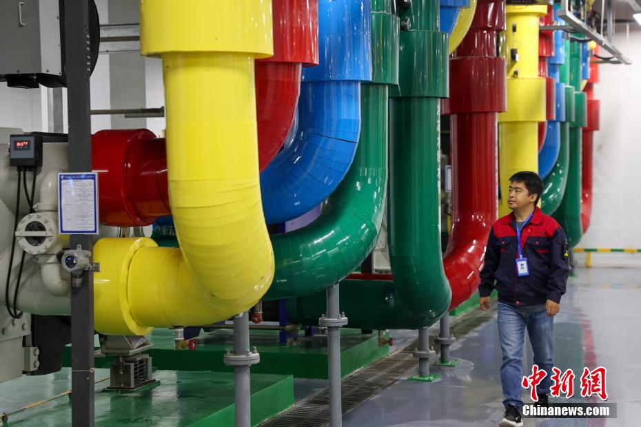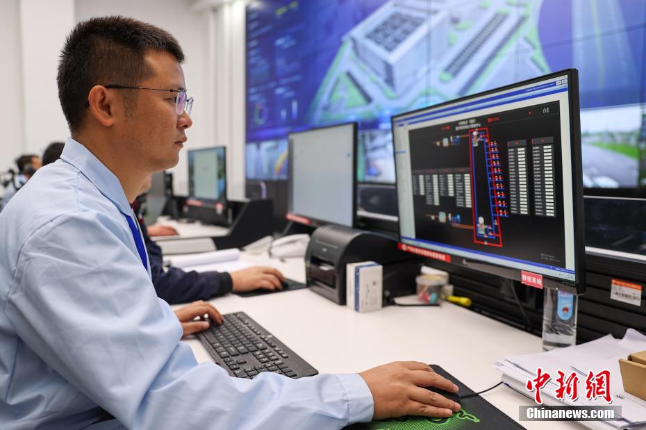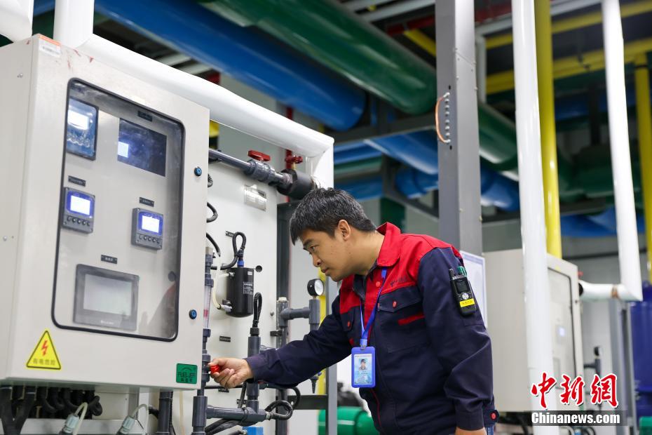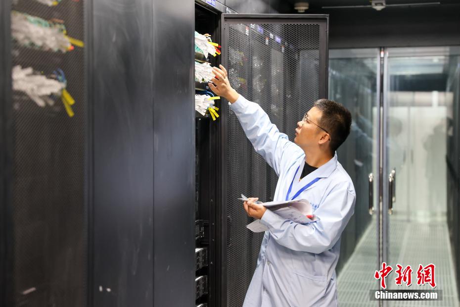 该中心是中国首个100%清洁能源可溯源的零碳大数据中心,绿色、零碳、可溯源是该数据中心的关键特征。图为工作人员在机房巡视巡检。(图片来源:本文图片均自中新网)
