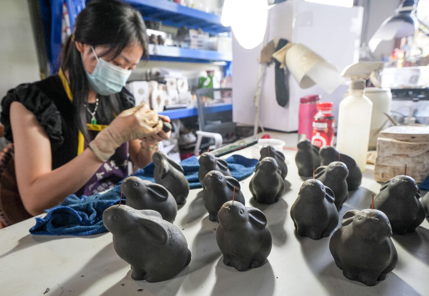 图为9月10日,无锡惠山泥人厂的工作人员在制作兔子泥塑。