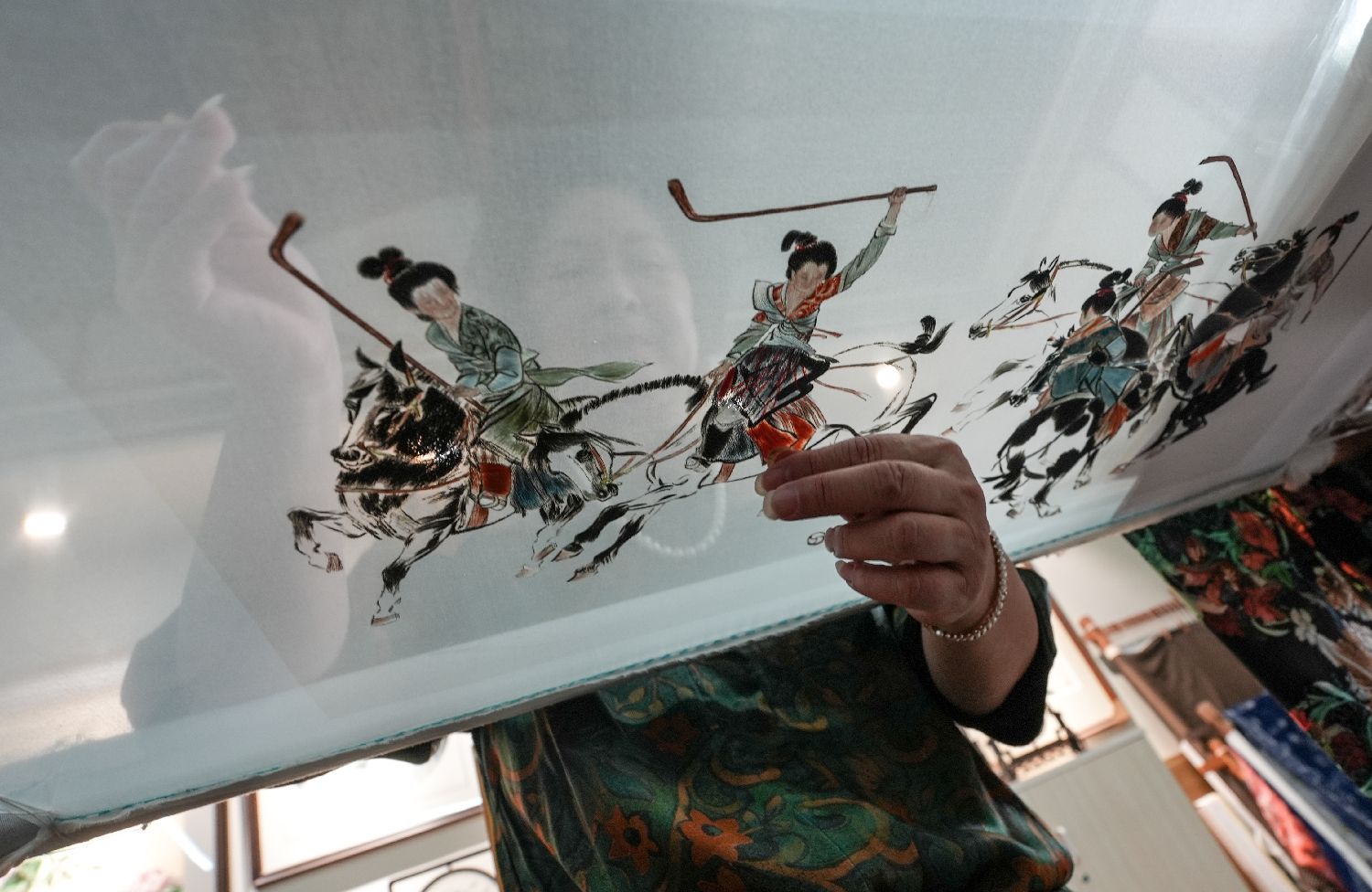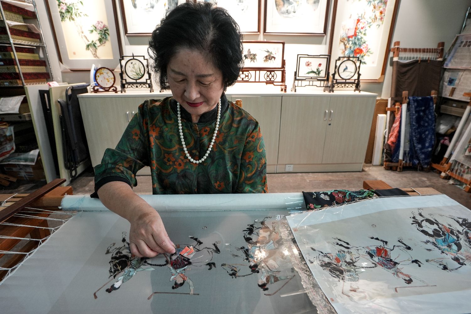 图为9月10日,中国工艺美术大师赵红育在制作无锡精微绣双面绣作品。苏绣(无锡精微绣)于2008年被列入第二批中国国家级非物质文化遗产。