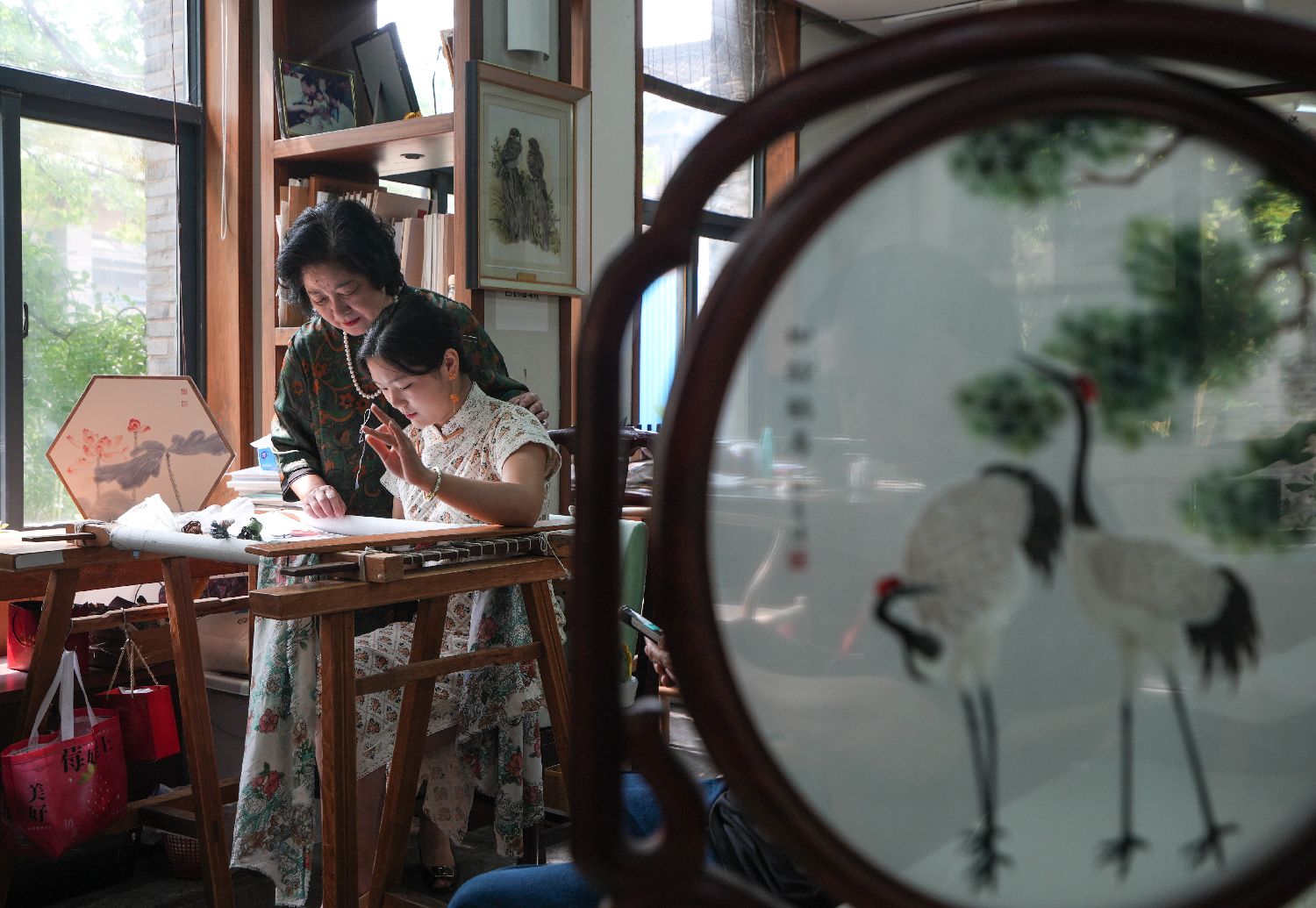 图为9月10日,中国工艺美术大师赵红育(左)在辅导学生制作无锡精微绣双面绣作品。
