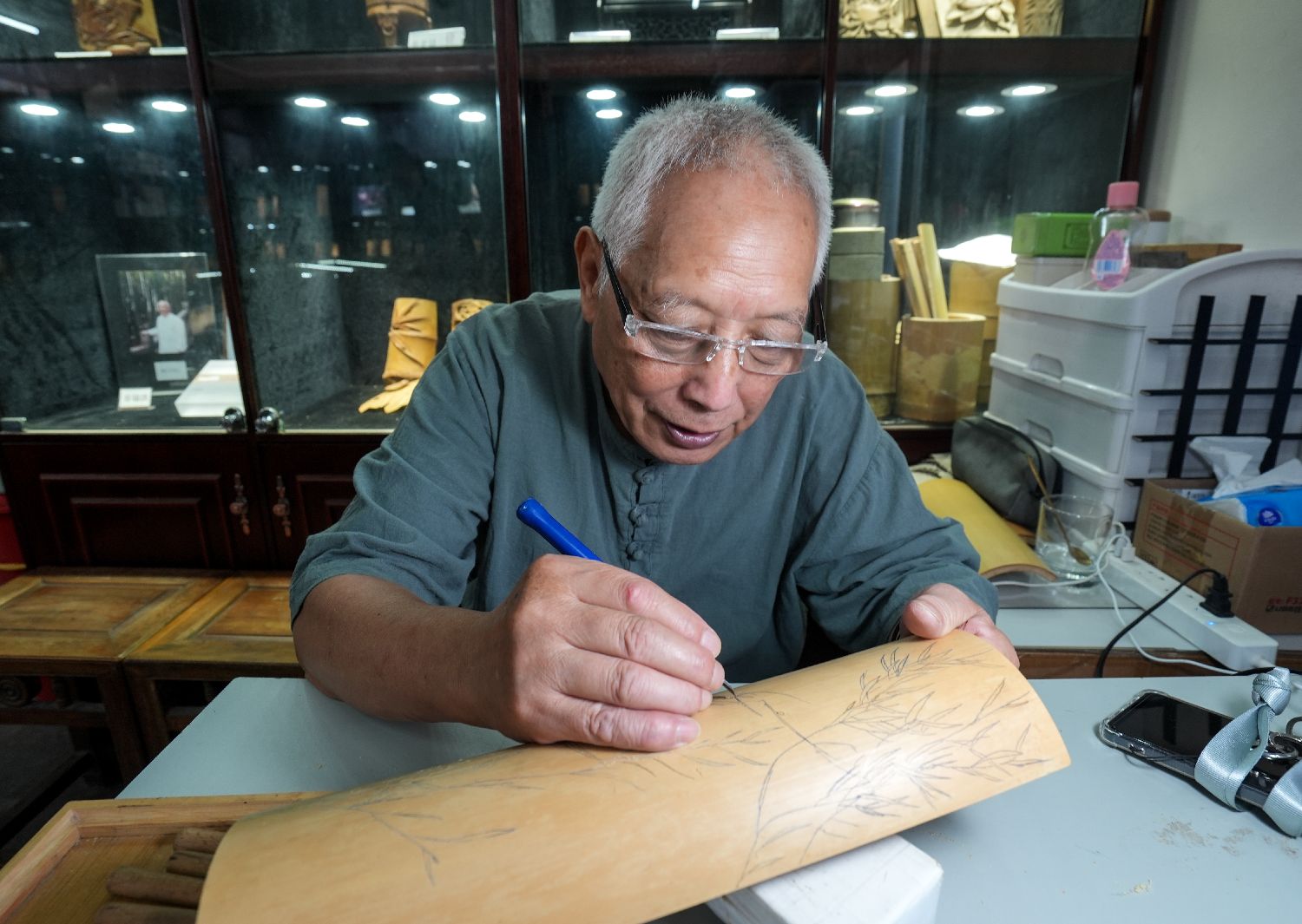 图为9月10日,中国国家级非物质文化遗产竹刻(无锡留青竹刻)代表性传承人乔锦洪在进行创作。