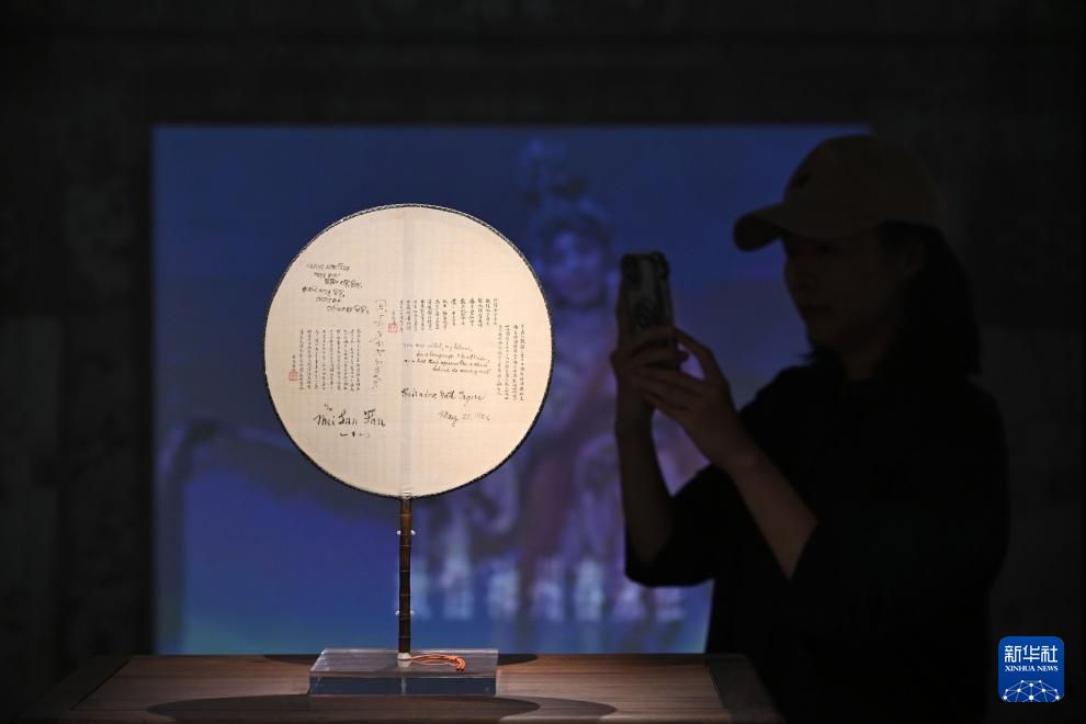 图为观众拍摄印度诗人泰戈尔为梅兰芳书写的团扇。