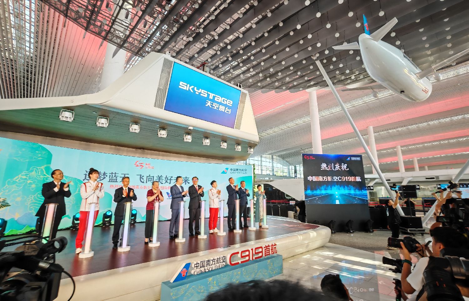 9月19日,中国南方航空首架C919国产大飞机正式迈入商业运营新阶段。图为首航仪式现场。(图片来源:中新社)