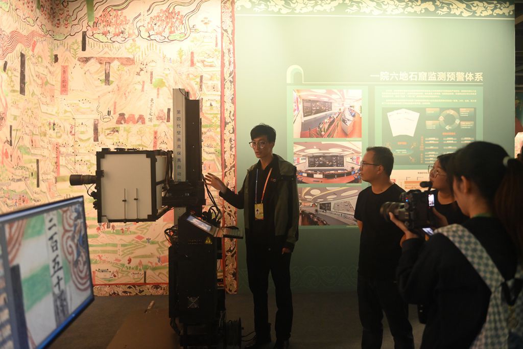 9月21日,在甘肃省敦煌市第七届丝绸之路(敦煌)国际文化博览会展馆内,游客参观敦煌研究院“典范”“高地”建设成果展中的第四代壁画高保真自动拍摄装置。(图片来源:中新社)