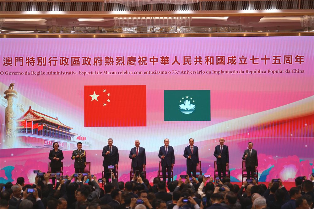澳门特区政府1日上午分别在金莲花广场和中国与葡语国家商贸合作服务平台综合体举行升旗仪式和酒会,庆祝中华人民共和国成立75周年。
