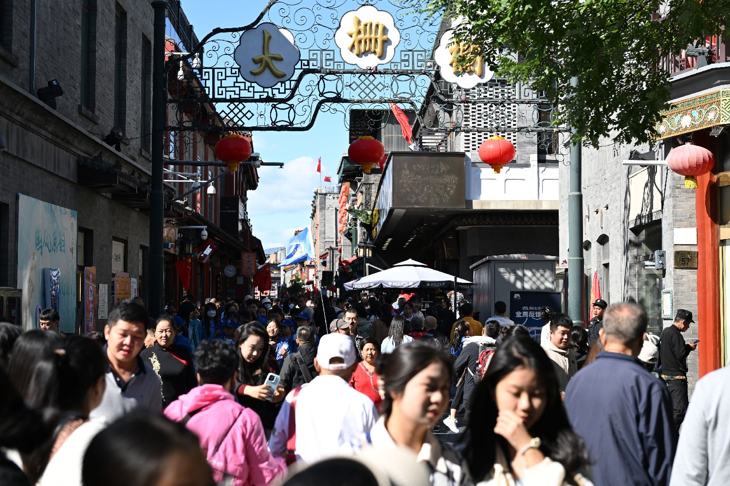 10月1日,国庆假期第一天,北京前门步行街游人如织。图为游客在大栅栏游览。(图片来源:中新社)