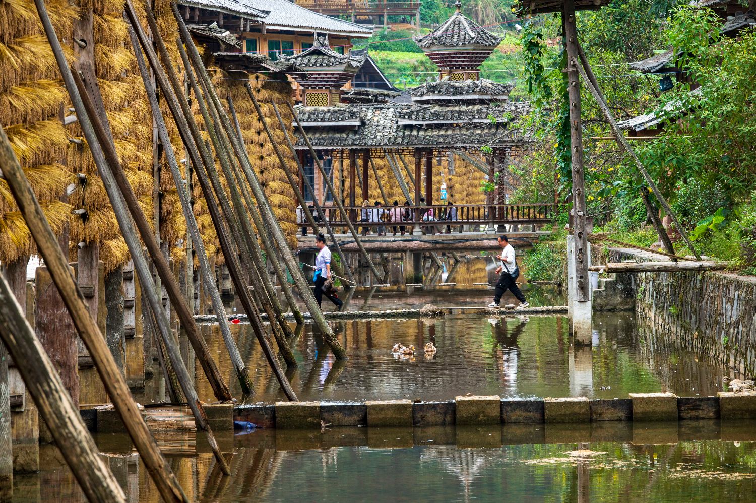 10月21日,在贵州省从江县高增乡占里村,人们从“晒秋”禾晾架旁走过。