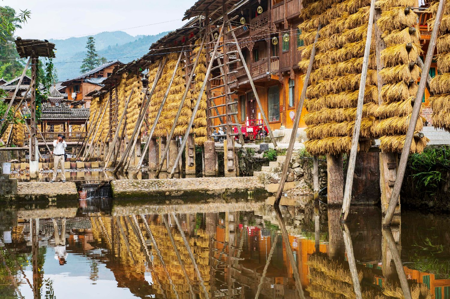 10月21日,游客在贵州省从江县高增乡占里村拍摄禾晾“晒秋”景观。