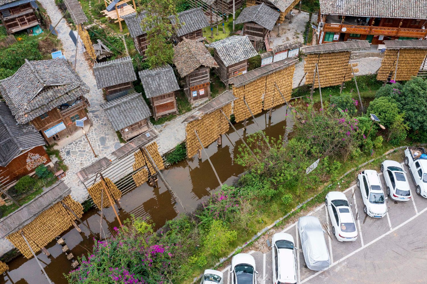金秋时节,贵州省黔东南苗族侗族自治州从江县高增乡占里村侗族村民将丰收的糯稻谷晾晒在禾晾架上,禾晾与侗寨房屋相映成景。占里村自古就有禾晾“晒秋”的传统,如今,禾晾“晒秋”已成为当地秋日里的一张特色旅游名片,吸引游客前往观赏。