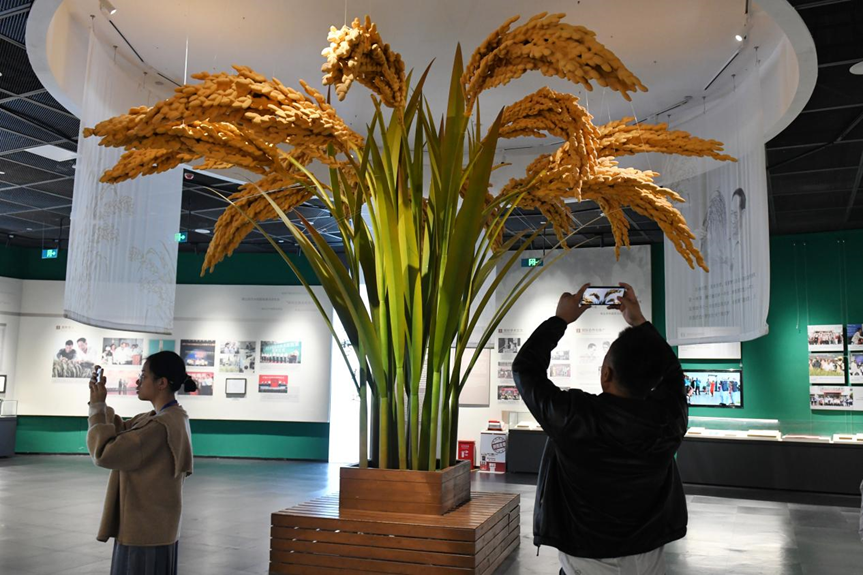 10月28日,华媒代表在隆平水稻博物馆拍摄巨型稻穗模型。