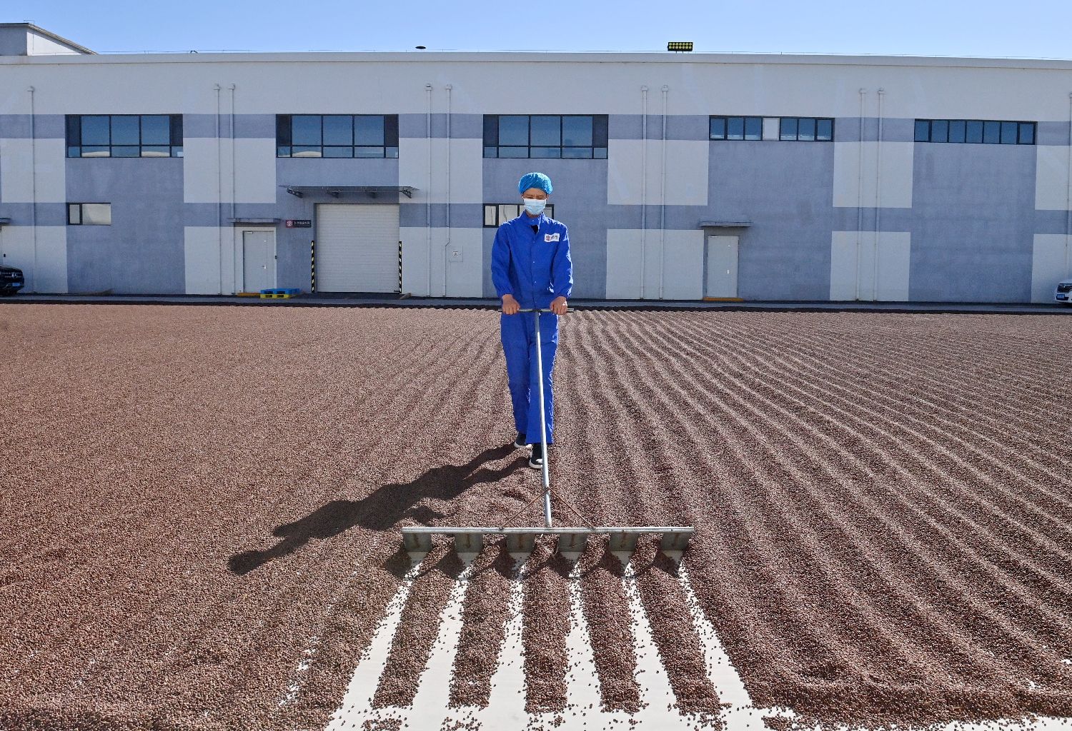 2023年9月13日,吉林梅河口,松子加工企业的工人在晾晒松子。(图片来源:中新社)