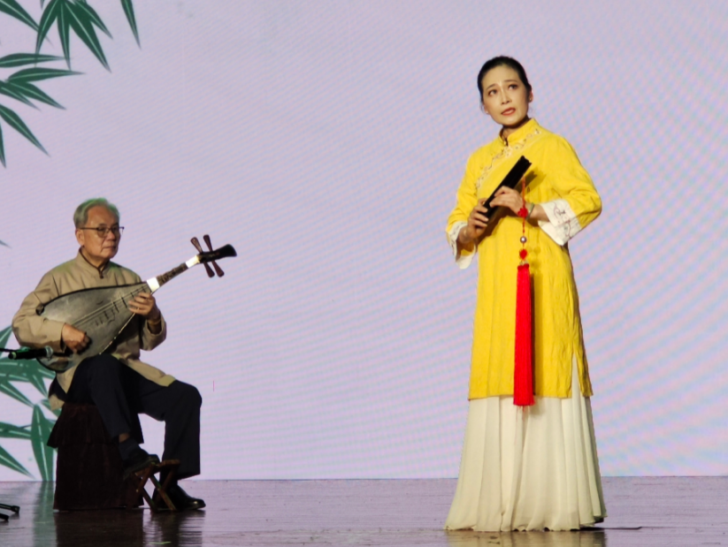 2022年5月27日,“非遗进校园——2022年闽台艺术家南音音乐会”在福建艺术职业学院音乐厅举行,台湾知名南音艺术家卓圣翔(左一)与弟子罗纯祯(右一)一同演绎卓圣翔用唐朝诗人金昌绪的《春怨》谱作的新南曲。(图片来源:受访者供图)