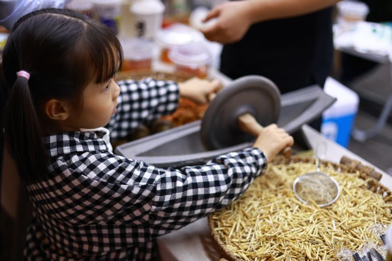市集上,有很多摊主为吸引人流,推出了各类体验项目。图为一名小女孩尝试研磨茶叶。