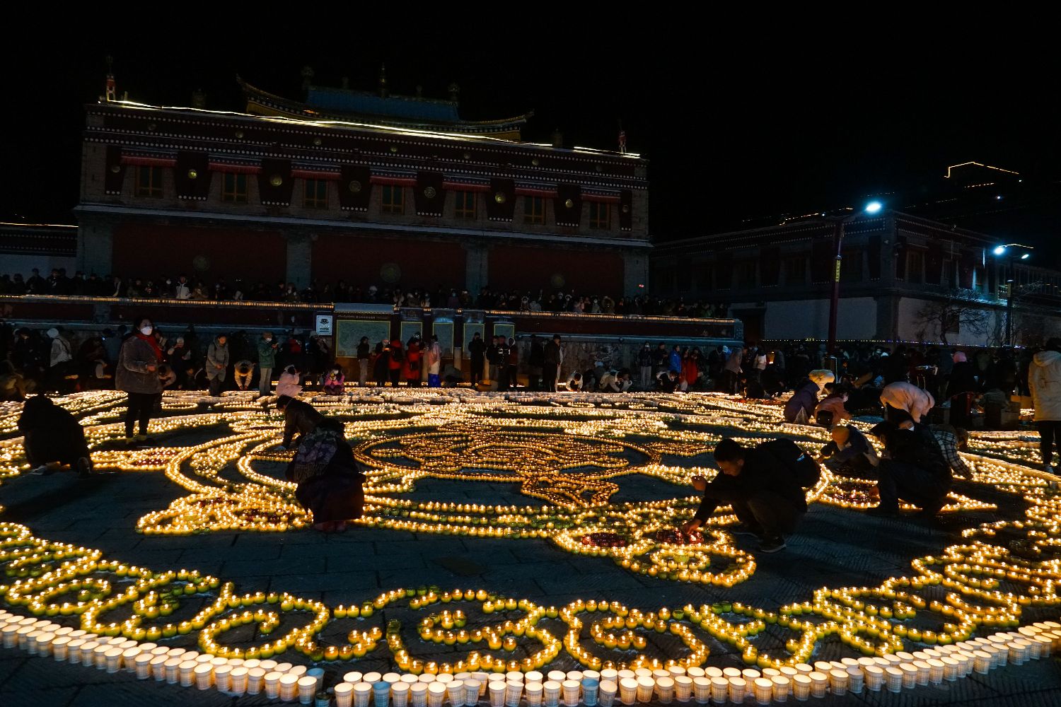傍晚六时许,在塔尔寺标志性建筑八宝如意塔周围,僧众在摆成各种图案、藏汉字符的灯阵中小心翼翼穿行,用纸板围挡住摇曳火光,蹲在地上一遍遍重新燃起被风吹熄的点点火苗,口中默诵经文,不少人环顾四周,高举手机,记录殊胜时刻。