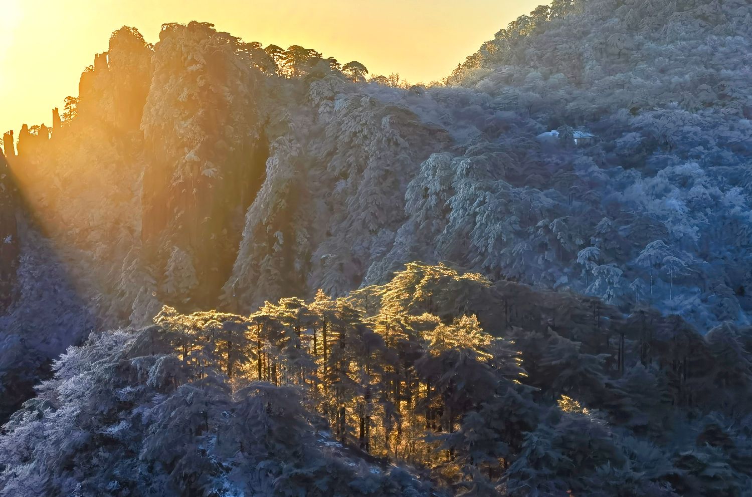 受寒潮天气影响,黄山风景区25日晚迎来降雪,五百里黄山换上了白色的新装。