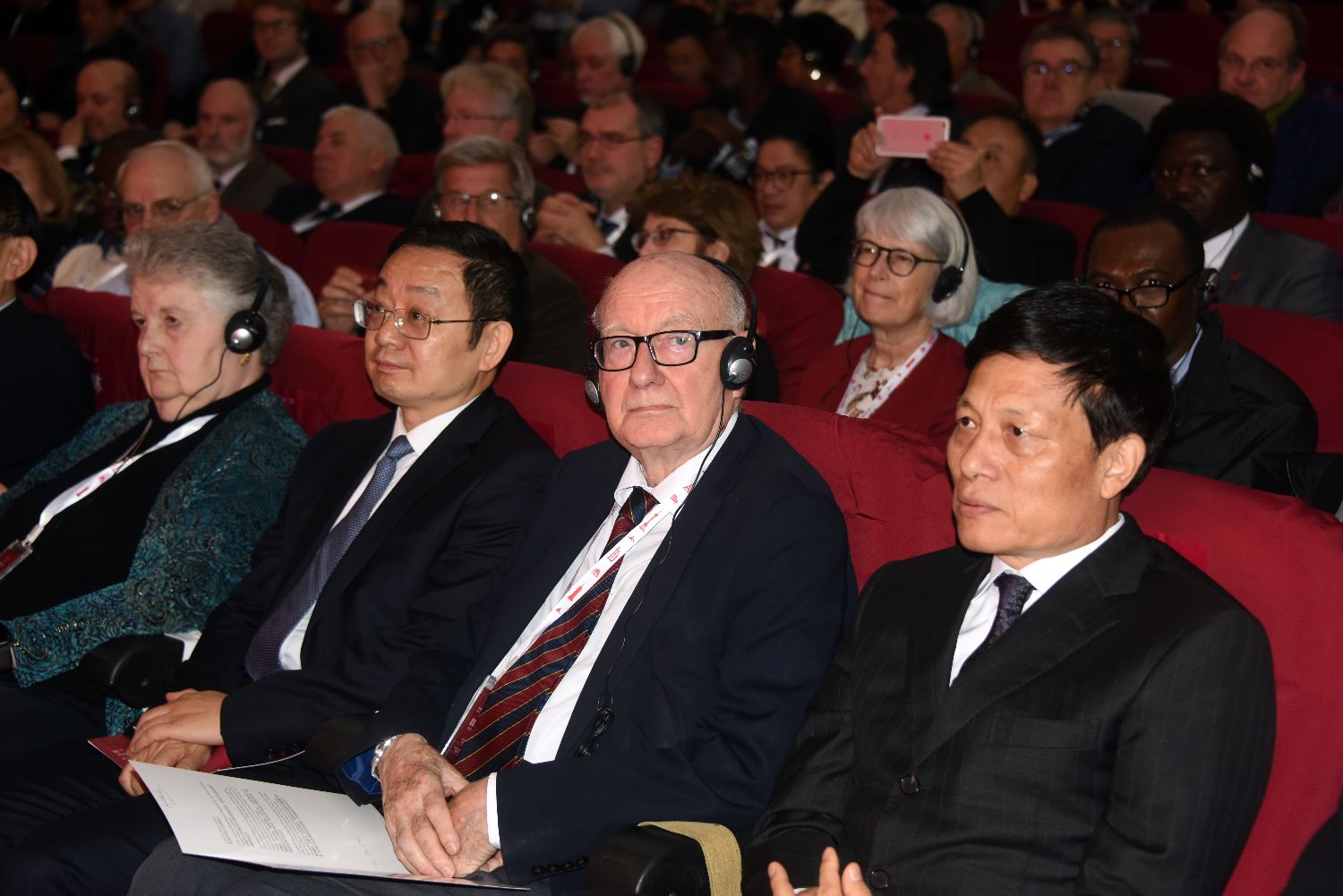 资料图为2019年12月14日,著名考古学家、英国剑桥大学教授伦福儒(前排右二)在上海参加第四届世界考古论坛。(图片来源:中新社)