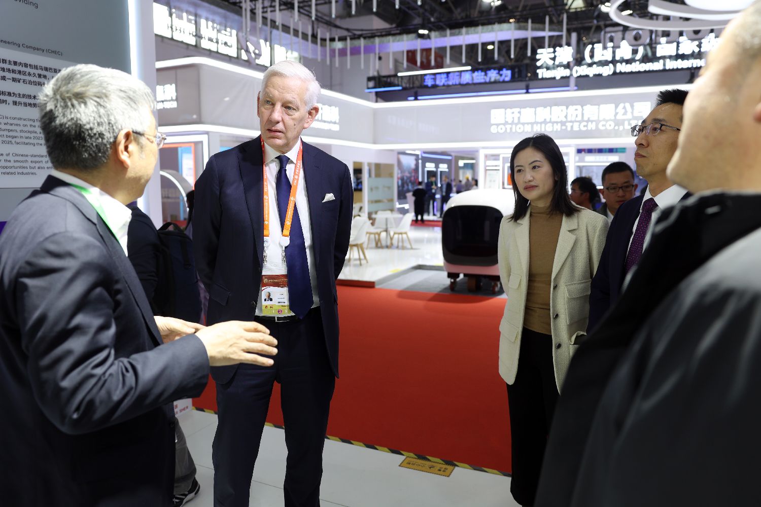 11月26日,英国力拓集团董事长鲍达民(Dominic Barton、左2)在展区与嘉宾交流。