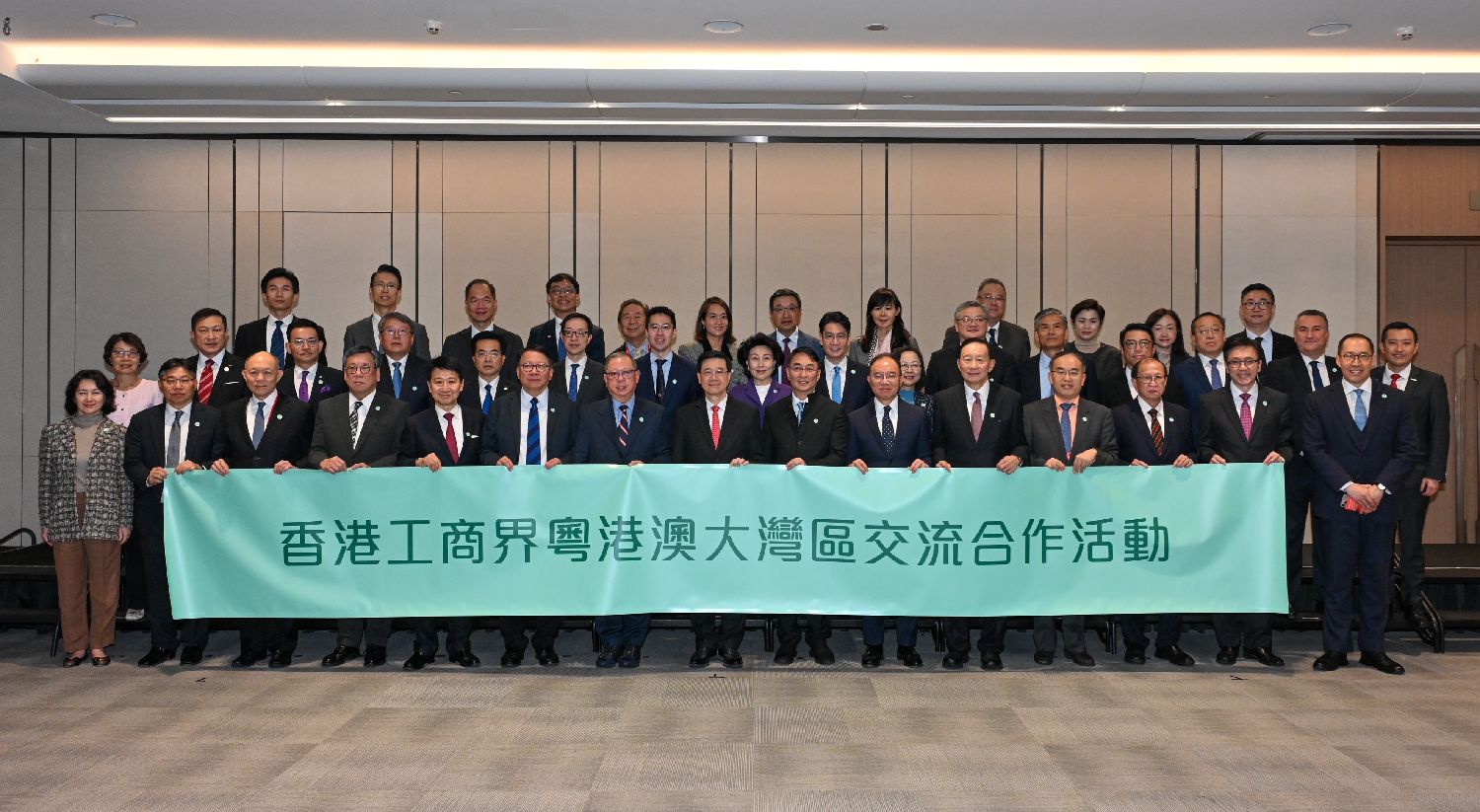 11月25日,香港特区行政长官李家超(第一排中)率领特区政府及工商界代表团到访广州。图为代表团成员在粤港深化经贸投资合作交流会前合影。(图片来源:本文图片均为香港特区政府新闻处供图)